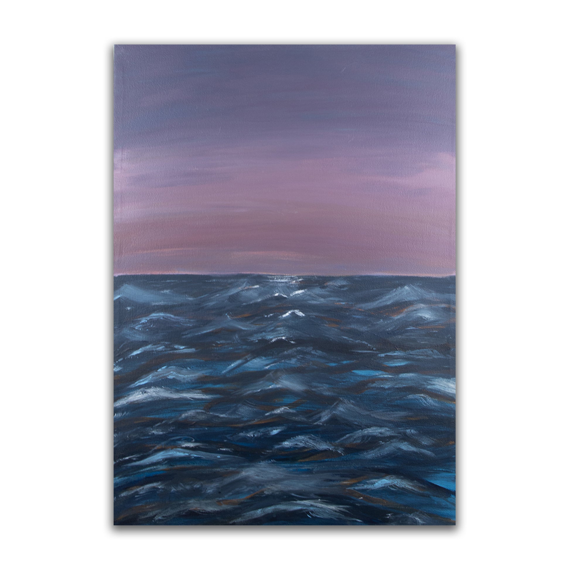 A quiet horizon drifts between dusk and dream in As the Sea Sleeps. Gentle waves fade into a violet sky, where movement and stillness meet in balance. This piece captures the sea’s softer voice, the calm that comes after the storm, the moment when even the ocean seems to rest.